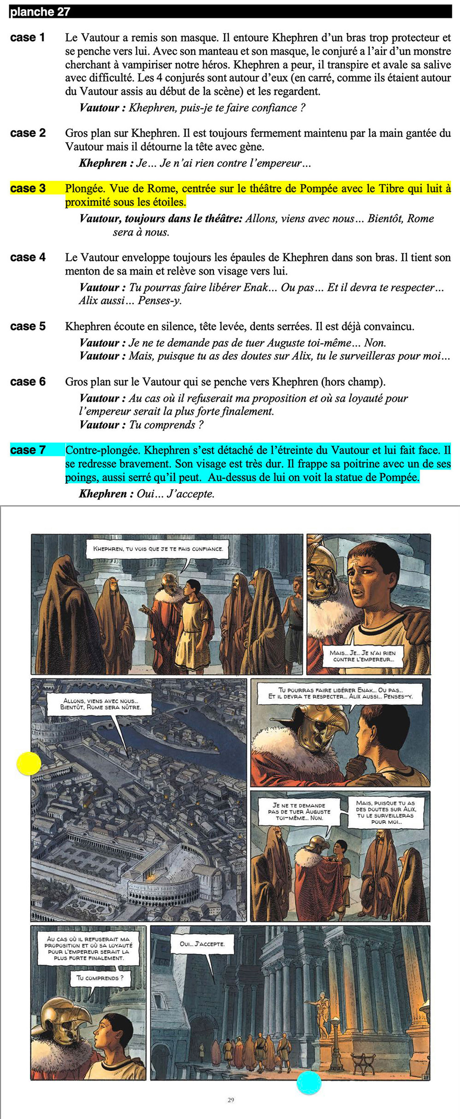 Si l’on observe la planche 27 (p. 29) du troisième tome (La Conjuration des rapaces) reproduite ci-dessous, on constate que ces choix de mise en scène du récit (pas simplement de mise en page) dans le théâtre de Pompée correspondent tantôt strictement aux indications textuelles initiales de la scénariste (Fig. 1, en jaune, case 3), tantôt à des modifications opérées par le dessinateur (Fig. 1, en bleu, case 7)29.