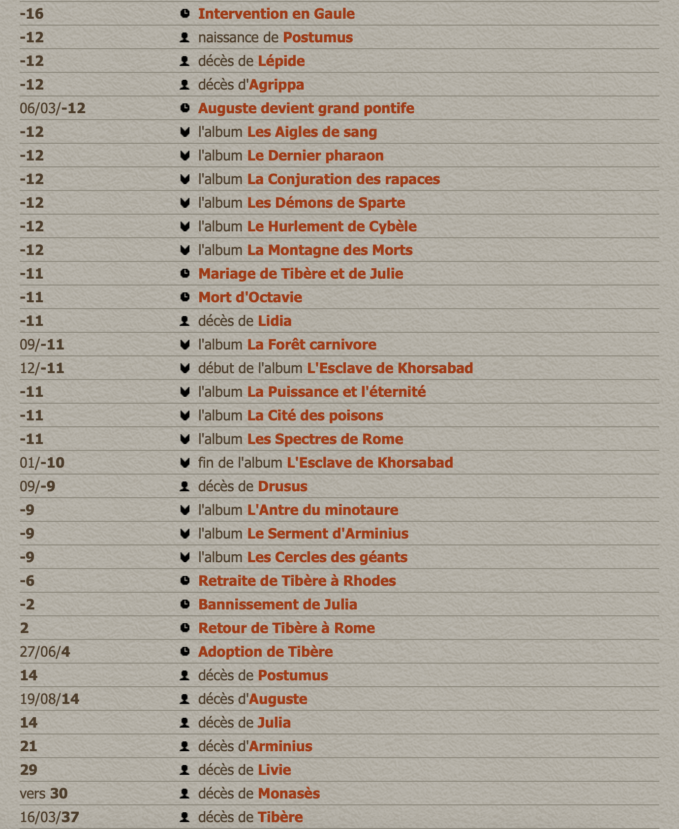 L’entrée « Événements131 » comporte une chronologie renvoyant par des liens hypertextes à des éléments qu’une notice détaille ; elle est construite entre les bornes de la fondation de Rome (‑753)132 et la chute de Constantinople (1453)133 et intègre à la fois des événements historiques ponctuels et isolés (comme la « Bataille d’Actium134 ») mais aussi le titre de chaque album de la série Alix senator pour les situer dans la chronologie générale. Elle est régulièrement mise à jour sur sa partie centrale qui concerne les aventures d’Alix. On voit ainsi que les six premiers tomes, dont l’intrigue se déroule tambour battant, comportent des événements qui s’enchaînent mois après mois sur l’année ‑12 ; puis le temps avance et les albums du Serment d’Arminius (2023) et du Cercle des géants (2024) ont lieu quant à eux en ‑9. La Fig. 10 montre l’intégration de chaque album dans l’empan qui va de ‑12 à ‑9 (pour l'album sorti en 2024). Chaque événement est présenté en deux temps, d’abord sa description selon le critère « événement historique135 » ou « événement fictif136 » puis sa date et enfin le récit que l’on peut en faire.