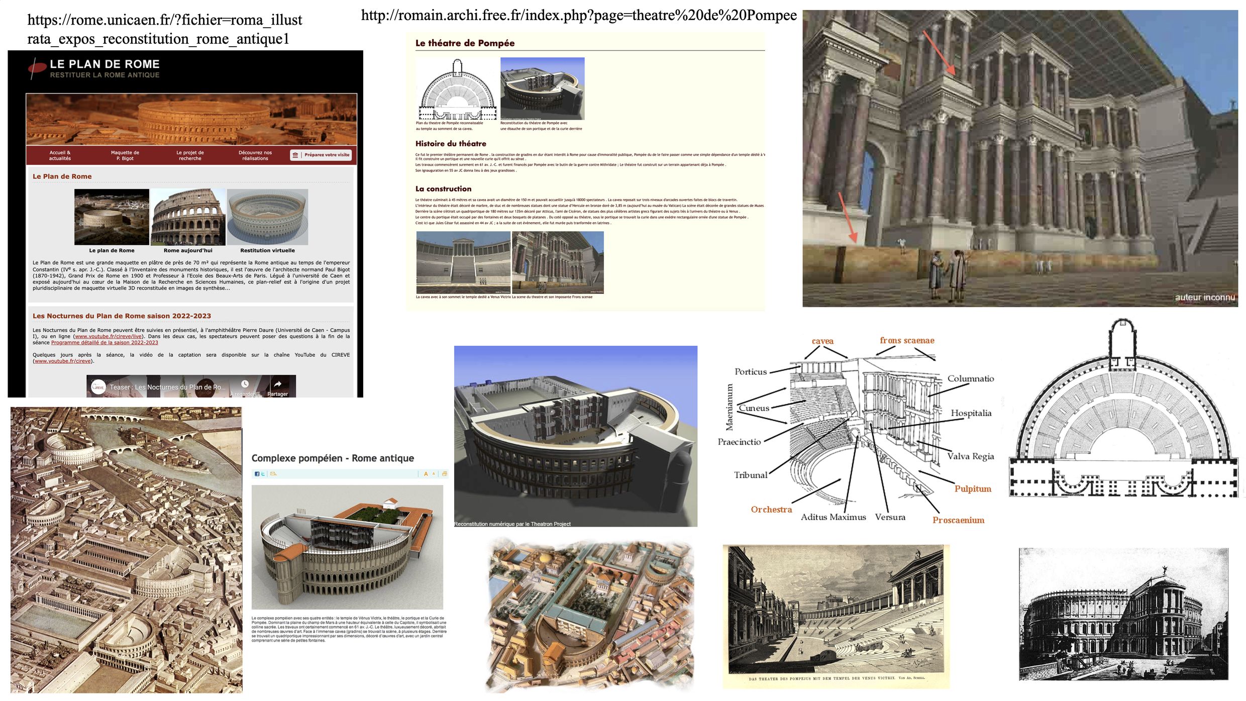 Figure 2. Montage comportant une partie de la documentation préparatoire de la scénariste pour une séquence se déroulant au théâtre de Pompée.
