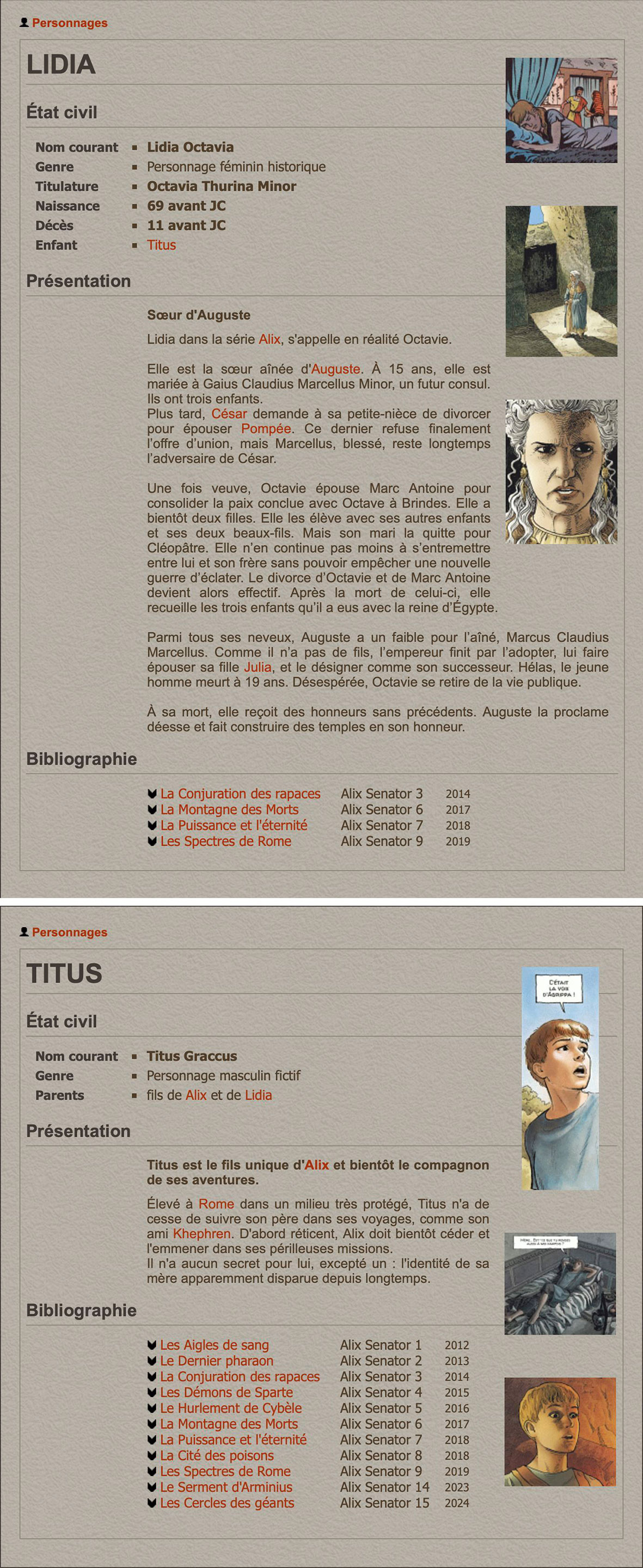 L’encyclopédie comporte actuellement 278 entrées115 dans l’« index simple116 », précédées d’un symbole spécifique parmi six, repérables aussi dans le menu de gauche et correspondant aux entrées « Albums117 » (seulement ceux de la série Alix senator), « Auteurs118 » (scénaristes, dessinateurs et coloristes), « Personnages119 », « Événements120 », « Lieux121 » (avec une carte interactive) et « Vrai/faux122 », permettant d’accéder à du contenu regroupé dans ces catégories. Par exemple (Fig. 8), si on clique sur « Lidia123 » dans le lexique, sa fiche s’ouvre dans « personnages » : on y trouve son état civil, son classement comme personnage historique, sa titulature124, sa naissance, sa mort et son « enfant » (mais le lien hypertexte qui renvoie vers la fiche de « Titus125 » précise bien alors qu’il s’agit en revanche d’un personnage masculin fictif). Et comme le personnage apparaît pour la première fois chez Martin (dans Le Tombeau étrusque), on trouve une illustration de la jeune Lidia dans cet Alix et deux illustrations de Lidia âgée dans Alix senator. Titus étant en revanche spécifique à Alix senator, les illustrations utilisées ne sont tirées que de la série dérivée (d’où l’esthétique unifiée).