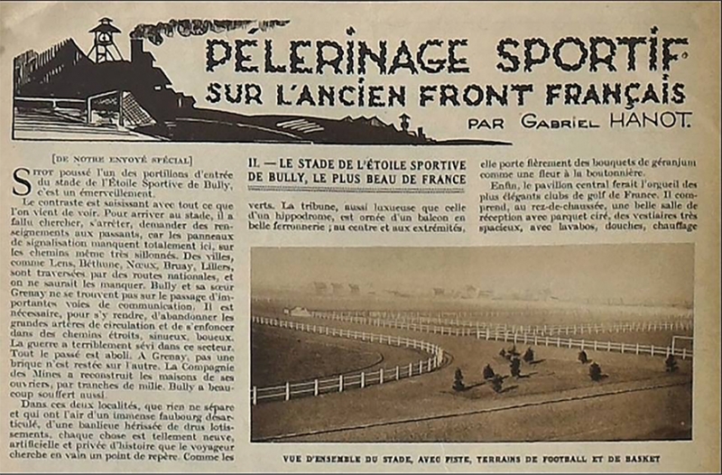 « Le stade de l’Étoile Sportive de Bully, c’est le monument sportif de la région, c’est le modèle qu’on cite en exemple, c’est la curiosité du pays […] La tribune, aussi luxueuse que celle d’un hippodrome, est ornée d’un balcon en belle ferronnerie ; au centre et aux extrémités, elle porte fièrement des bouquets de géranium comme une fleur à la boutonnière. Enfin, le pavillon central ferait l’orgueil des plus élégants clubs de golf de France20 […] ».
