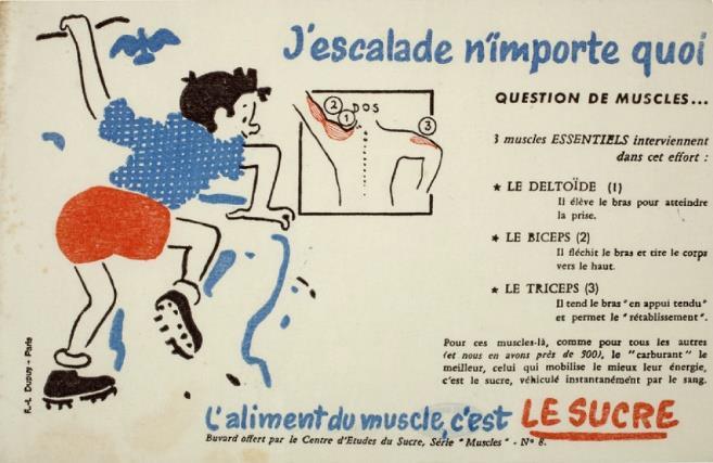 Figure 1. Buvard publicitaire « J’escalade n’importe quoi », Série Muscles, Centre d’Études du Sucre (135 mm x 210 mm), vers 1955
